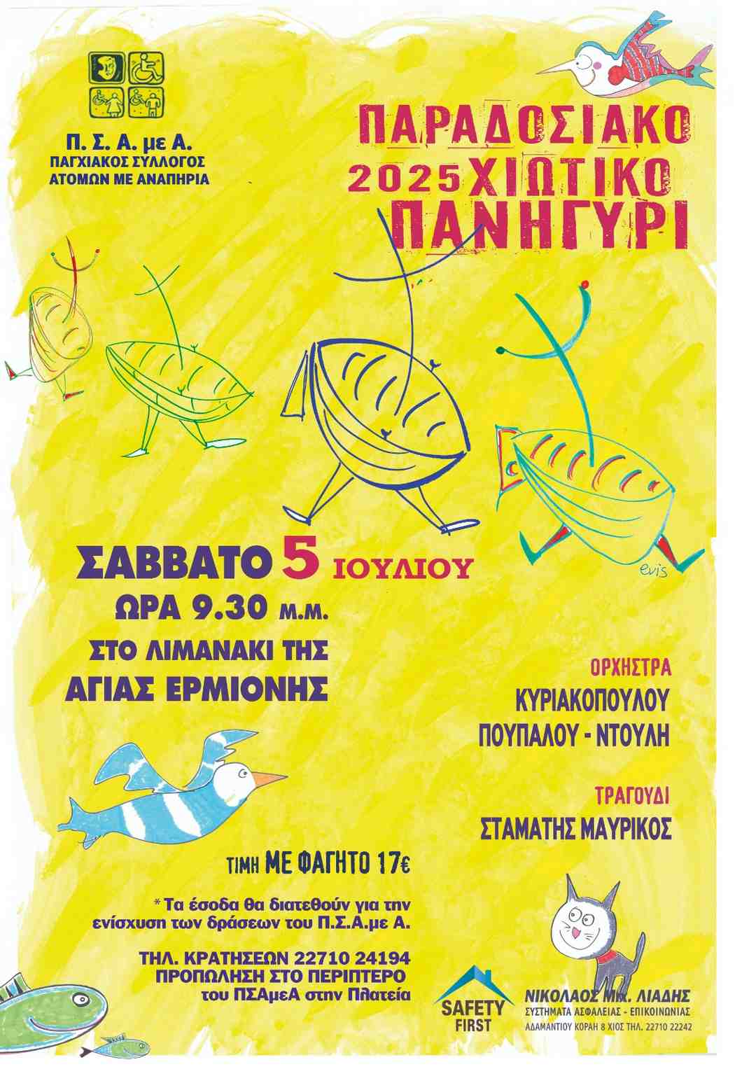 Ο Παγχιακός Σύλλογος Ατόμων με Αναπηρία (Π.Σ.Α.μεΑ.) διοργανώνει το Παραδοσιακό Χιώτικο Πανηγύρι το Σάββατο 5 Ιουλίου 2025, στις 21:30, στο Λιμανάκι της Αγίας Ερμιόνης. Η εκδήλωση αποτελεί ετήσιο θεσμό που στοχεύει στη διατήρηση της παραδοσιακής χιώτικης μουσικής και χορού, προσφέροντας παράλληλα μια ευχάριστη βραδιά για τα μέλη, τους φίλους και το ευρύ κοινό.