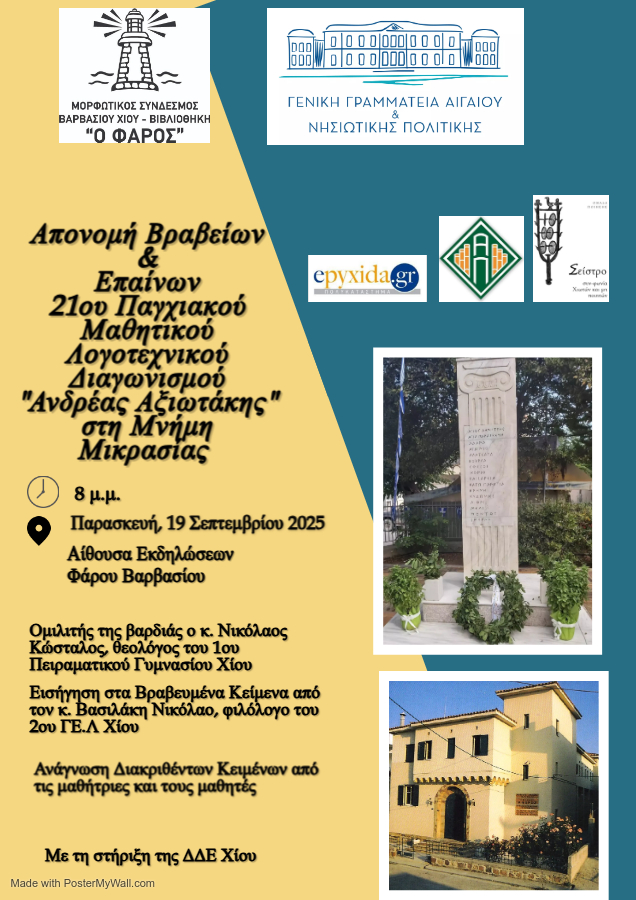 Ολοκληρώθηκε ο 21ος Παγχιακός Μαθητικός Λογοτεχνικός Διαγωνισμός «Ανδρέας Αξιωτάκης» του Μορφωτικού Συνδέσμου Βαρβασίου Χίου Βιβλιοθήκη «Ο Φάρος», σχολικού έτους 2023-2024, με τη συνεργασία της Διεύθυνσης Δευτεροβάθμιας Εκπαίδευσης Ν. Χίου. Συμμετείχαν μαθητές και μαθήτριες της Β’ Λυκείου του Νομού μας.