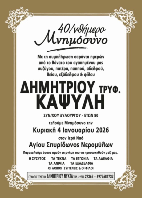 η οικογένειά του τελεί 40ήμερο μνημόσυνο την Κυριακή 4 Ιανουαρίου 2026, στον Ιερό Ναό Αγίου Σπυρίδωνος Νερομύλων.