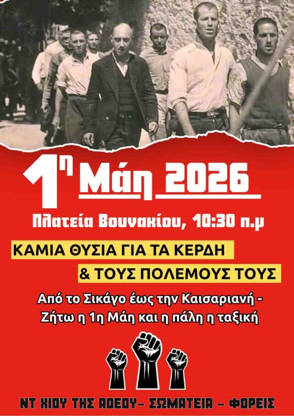 Το ΝΤ Χίου της ΑΔΕΔΥ καλεί κάθε εργαζόμενο στο Δημόσιο και ιδιωτικό τομέα, τους φοιτητές, τους μαθητές και όλο τον Χιώτικο λαό να δώσουν δυναμικό παρόν στην απεργιακή κινητοποίηση για την Εργατική Πρωτομαγιά, Παρασκευή 1η Μάη, 10:30 στην Πλατεία Βουνακίου.