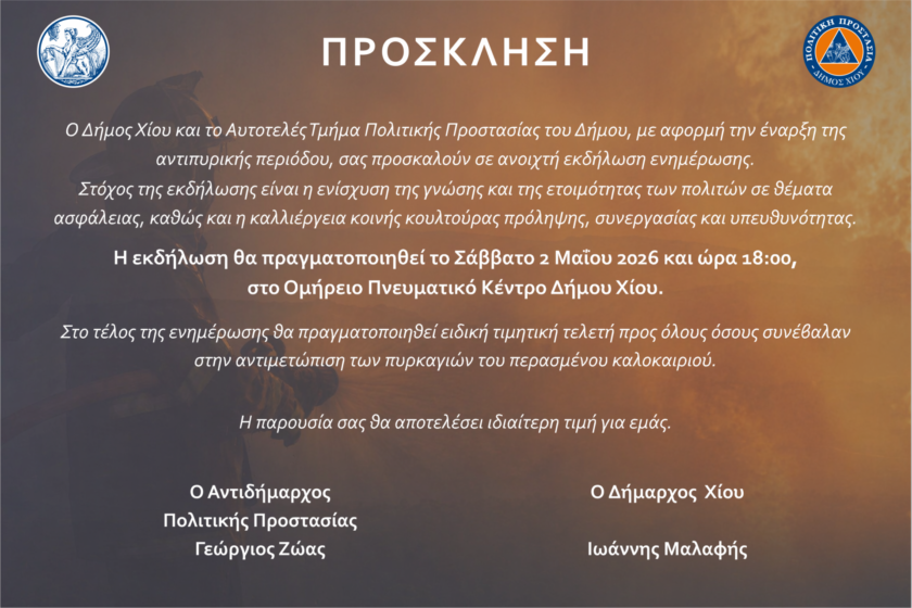 Ο Δήμος Χίου και το Αυτοτελές Τμήμα Πολιτικής Προστασίας, ενόψει της έναρξης της νέας αντιπυρικής περιόδου, σας προσκαλούν στην ανοιχτή ενημερωτική εκδήλωση που θα πραγματοποιηθεί το Σάββατο 2 Μαΐου 2026 και ώρα 18:00, στο Ομήρειο Πνευματικό Κέντρο.