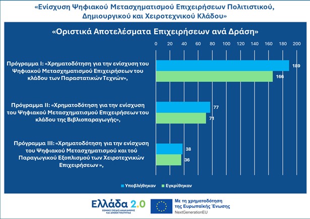 Στο Πρόγραμμα Ι: «Χρηματοδότηση για την ενίσχυση του Ψηφιακού Μετασχηματισμού Επιχειρήσεων του κλάδου των Παραστατικών Τεχνών», υποβλήθηκαν 189 αιτήσεις, εκ των οποίων εγκρίθηκαν οι 166.