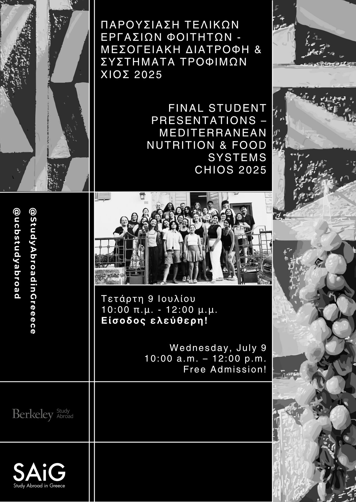 Την Τετάρτη 9 Ιουλίου 2025, στις 10:00 π.μ., στο Ομήρειο Πνευματικό Κέντρο Δήμου Χίου (αίθουσα συνεδρίων), οι φοιτητές θα παρουσιάσουν στο κοινό τις τελικές τους εργασίες, με επίκεντρο τη διατροφή και τις διεθνείς προεκτάσεις της Μεσογειακής Κουζίνας.