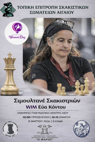 Η Χίος συμμετέχει στην πανελλήνια δράση «Οι Βασίλισσες του Σκακιού ζωντανεύουν τις πλατείες» της Ελληνικής Σκακιστικής Ομοσπονδίας, γιορτάζοντας την Παγκόσμια Ημέρα της Γυναίκας, την Κυριακή 8 Μαρτίου 2026. Η δράση συνδιοργανώνεται από τον Σκακιστικό Όμιλο Παναγίας Καλλιμασιάς Χίου, τον Μορφωτικό Σύνδεσμο Βαρβασίου Χίου Βιβλιοθήκη «Φάρος» και τον Δήμο Χίου υπό την αιγίδα της ΕΣΟ και της Τοπικής Επιτροπής Σκακιστικών Σωματείων Αιγαίου και θα πραγματοποιηθεί στις 10:15 π.μ. στο Ομήρειο Πνευματικό Κέντρο Δήμου Χίου. Στο πλαίσιο της εκδήλωσης θα διεξαχθεί αγώνας σιμουλτανέ από τη WIM Εύα Κόντου, ελεγκτή εναέριας κυκλοφορίας και…