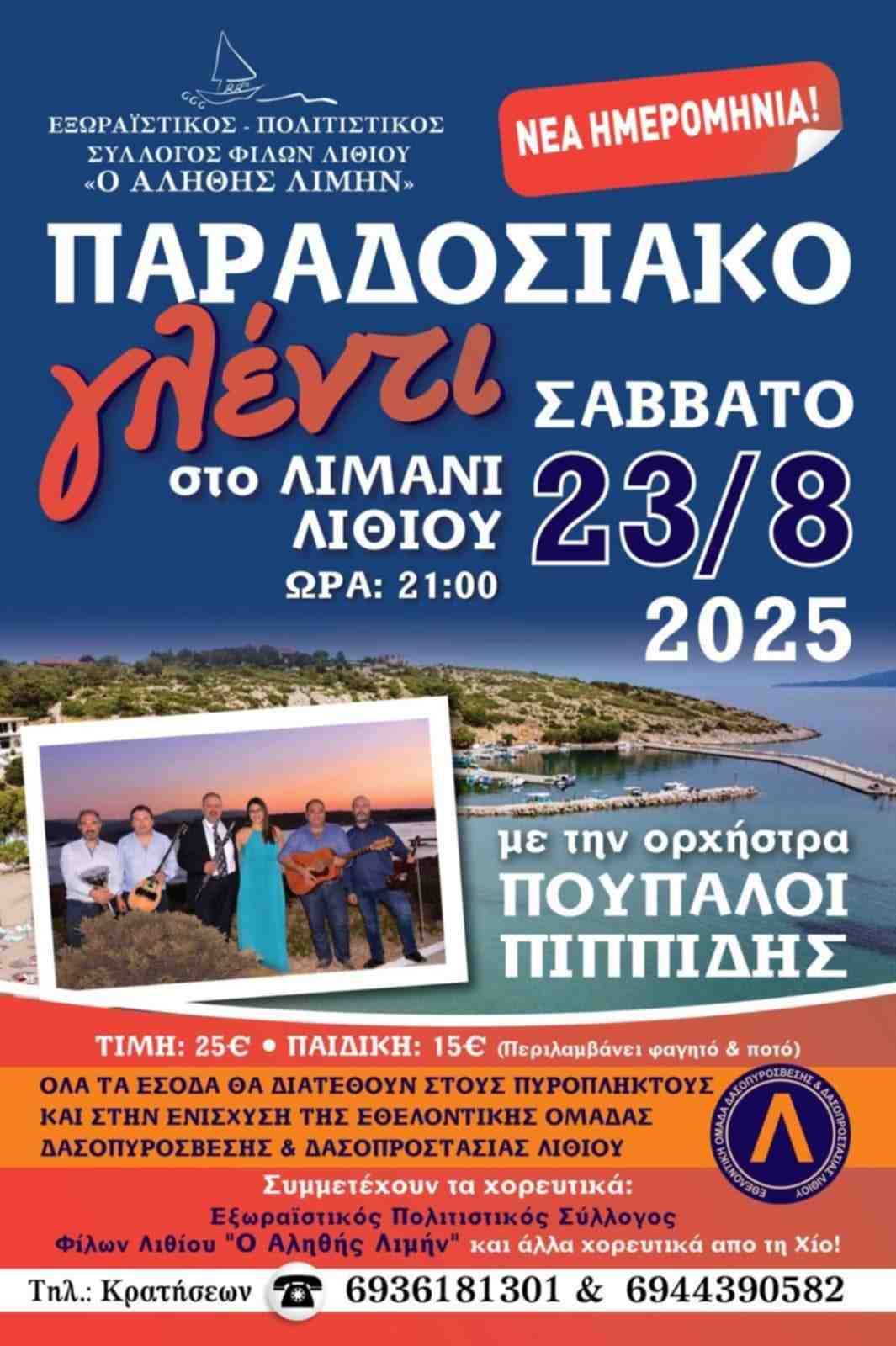 Ο Σύλλογος ανακοινώνει ότι το γλέντι θα πραγματοποιηθεί το Σάββατο 23 Αυγούστου 2025, στις 21:00, στο Λιμάνι Λιθίου. Η ορχήστρα Πιππίδη-Πούπαλου θα αναλάβει τη μουσική, ενώ θα συμμετάσχουν χοροί από τον Σύλλογο και άλλους συλλόγους του νησιού.