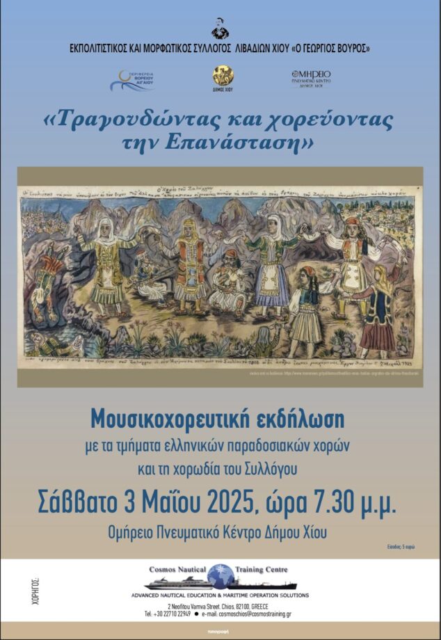 Ο Εκπολιτιστικός και Μορφωτικός Σύλλογος Λιβαδίων Χίου «Ο ΓΕΩΡΓΙΟΣ ΒΟΥΡΟΣ» θα πραγματοποιήσει εκδήλωση με τα χορευτικά τμήματα και τη χορωδία του στο Ομήρειο Πνευματικό Κέντρο του Δήμου Χίου, το Σάββατο 3 Μαΐου 2025 και ώρα 7:30 μ.μ.