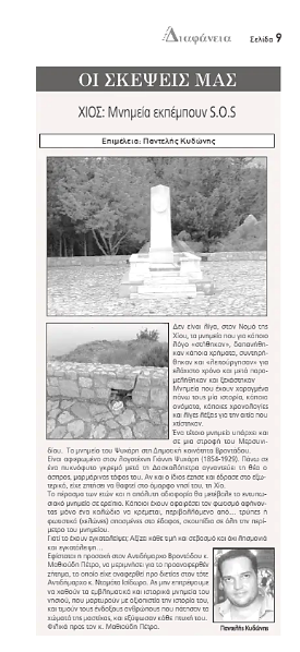 «Και γιατί μας τα γράφεις αυτά γιατρέ μου;» θα διερωτάστε οι περισσότεροι! Εξηγώ λοιπόν: Σε απόκομμα εφημερίδας («ΧΙΩΤΙΚΗ ΔΙΑΦΑΝΕΙΑ», 3/10/2024) υπάρχει άρθρο του κ. Παντελή Κυδώνη με τίτλο «Χίος: Μνημεία εκπέμπουν S.O.S.» και μια φωτογραφία του μνημείου του αειμνήστου Χιολάτρη Γιάννη Ψυχάρη, ο οποίος ως γνωστόν ομιλούσε και έγραφε στην «μαλλιαρή» διάλεκτο, δηλαδή το άκρον άωτον της Δημοτικής!…