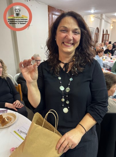 Ιδιαίτερη χαρά προκάλεσε και η ανάδειξη της δεύτερης τυχερής, της κας Χρυσούλας Τσιγκοπούλου, η οποία βρήκε το φλουρί της μεγάλης πίτας και παρέλαβε το γούρι του συλλόγου καθώς και ένα γεύμα στην ταβέρνα «Πεύκος» στα Διευχά, μέσα σε θερμά χειροκροτήματα και ευχές από όλους τους παρευρισκόμενους.