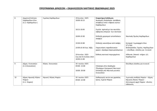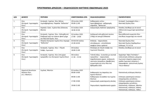 Το Κεντρικό Λιμεναρχείο Χίου αναβιώνει τον θεσμό της Ναυτικής Εβδομάδας και ανακοινώνει σειρά εκδηλώσεων που θα πραγματοποιηθούν από τις 29 Ιουνίου έως και τις 6 Ιουλίου 2025 σε πέντε σημεία του νησιωτικού συμπλέγματος: Χίο, Ψαρά, Οινούσσες, Μεστά και Καρδάμυλα.