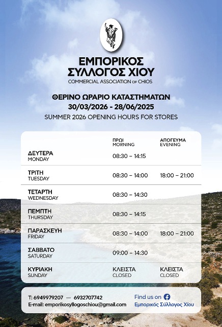 Από τις 5 έως και τις 13 Απριλίου 2026 θα ισχύσει το πασχαλινό ωράριο καταστημάτων στη Χίο, με διευρυμένες ώρες λειτουργίας κατά τη Μεγάλη Εβδομάδα.