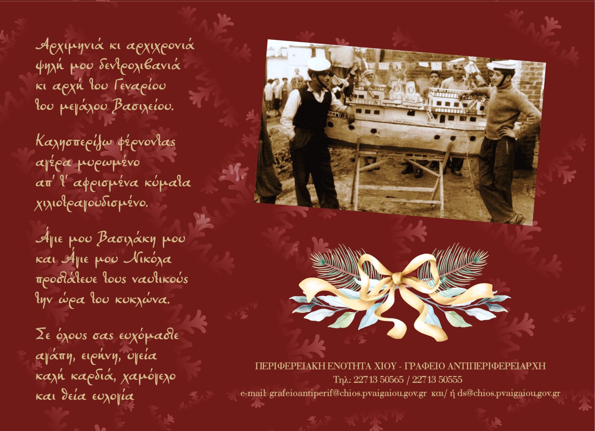 Παρακαλούμε να τιμήσετε με την παρουσία σας τις εκδηλώσεις εορτασμού για την Πρωτοχρονιά του Έτους 2026, καθώς και την ευλόγηση της αγιοβασιλόπιτας, που θα πραγματοποιηθούν στο Κεντρικό Κτίριο της Περιφερειακής Ενότητας Χίου.