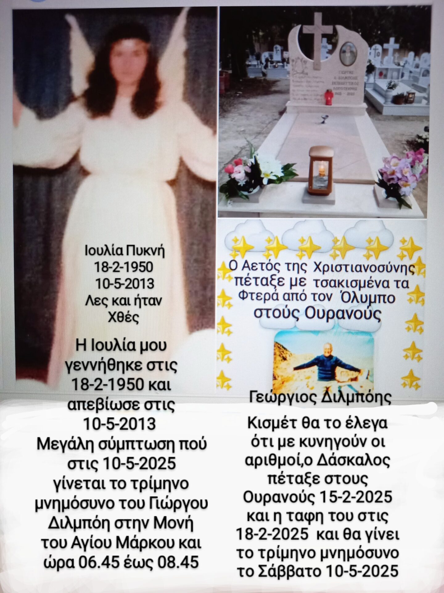 Ο φίλος μου Γεώργιος Διλμπόης παρέδωσε την ψυχή του στον Ύψιστον στις 15 Φεβρουαρίου 2025 ακριβώς την ίδια μέρα 15 Φεβρουαρίου 1927 είχε γεννηθεί η μάνα μου.