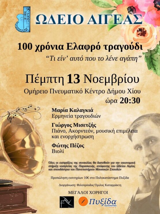 Το Ωδείο Αιγέας παρουσιάζει μια ξεχωριστή μουσική παράσταση αφιερωμένη στα 100 χρόνια του Ελληνικού Ελαφρού Τραγουδιού, ενός είδους που σημάδεψε ανεξίτηλα την ελληνική μουσική ιστορία με τη μελωδικότητα, τον ρομαντισμό και τη διαχρονική του γοητεία.