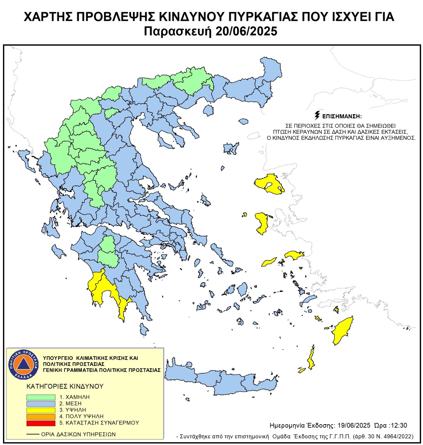 Σύμφωνα με τον χάρτη πρόβλεψης κινδύνου πυρκαγιάς της Πολιτικής Προστασίας, ο Δήμος μας κατατάσσεται στην Κατηγορία 2 – Μέσος Κίνδυνος εκδήλωσης πυρκαγιάς για την τρέχουσα ημέρα. Με βάση τα παραπάνω, καλούνται όλες οι εμπλεκόμενες υπηρεσίες του Δήμου να τεθούν σε κατάσταση ετοιμότητας, σύμφωνα με τα προβλεπόμενα στον επιχειρησιακό σχεδιασμό τους και τις αποφάσεις του Τοπικού Συντονιστικού Οργάνου Πολιτικής Προστασίας (Τ.Ε.Σ.Ο.Π.Π.). Παρακαλούνται οι πολίτες να είναι ιδιαίτερα προσεκτικοί, να αποφεύγουν ενέργειες που μπορεί να προκαλέσουν πυρκαγιά και να ακολουθούν τις οδηγίες των αρμόδιων αρχών.
