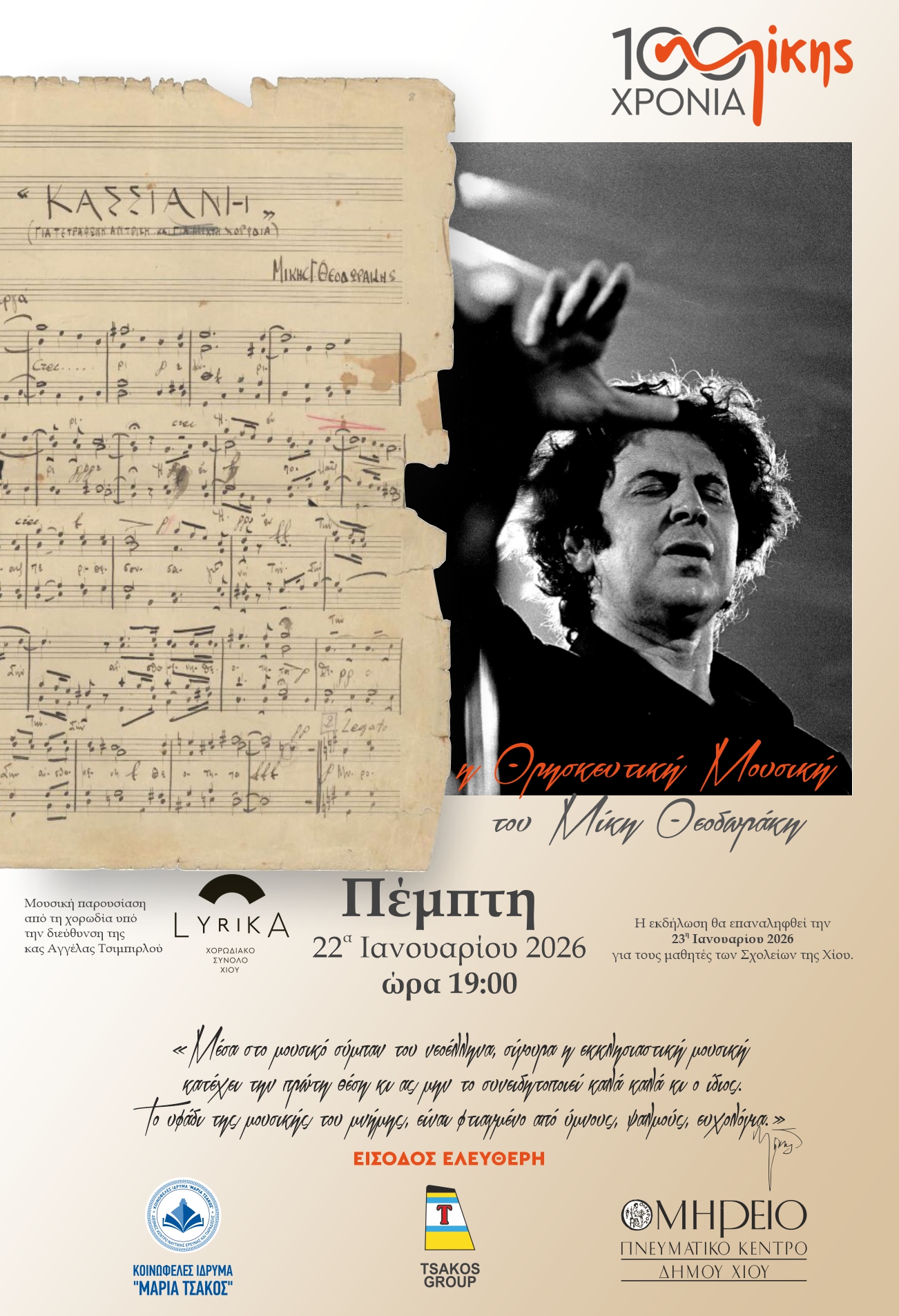 Επετειακή μουσική εκδήλωση τιμής & μνήμης για τα 100 χρόνια από την γέννηση του Μίκη Θεοδωράκη στην Χίο Το Κοινωφελές Ίδρυμα «Μαρία Τσάκος» – Διεθνές Κέντρο Ναυτικής Έρευνας και Παράδοσης διοργανώνει επετειακή μουσική εκδήλωση τιμής και μνήμης για τα 100 χρόνια από τη γέννηση του Μίκη Θεοδωράκη στη Χίο. Η εκδήλωση, με τίτλο «Η θρησκευτική μουσική του Μίκη Θεοδωράκη», θα πραγματοποιηθεί την Πέμπτη 22 Ιανουαρίου 2026, στις 19:00, στο Ομήρειο Πνευματικό Κέντρο Χίου, τιμώντας ένα από τα κορυφαία κεφάλαια του έργου του μεγάλου Έλληνα δημιουργού. Στο πλαίσιο της εκδήλωσης, ο…