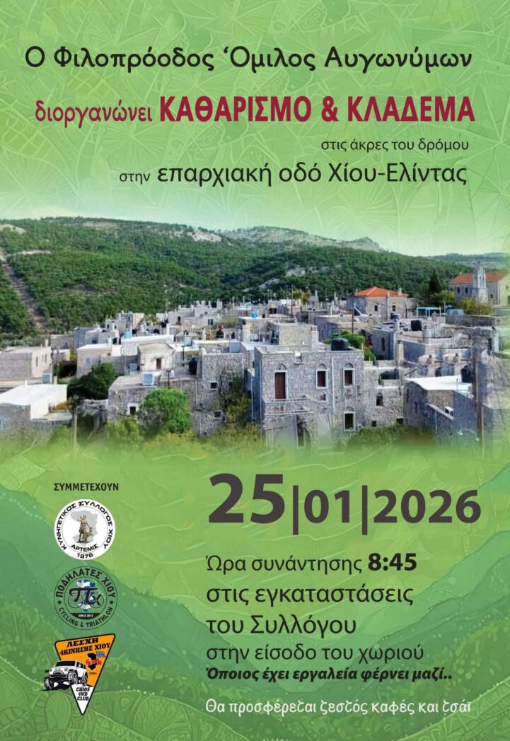 Ο Φιλοπρόοδος Όμιλος Αυγωνύμων ανακοΙνώνει ότι, στα πλαίσια των δράσεων του για το 2026, θα πραγματοποιηθεί καθαρισμός και κλάδεμα δέντρων επί της επαρχιακής οδού Χίου–Ελίντας, στην περιοχή του χωριού, στις 25 Ιανουαρίου. Η δράση θα γίνει υπό την καθοδήγηση του Δασαρχείου Χίου. Σε περίπτωση κακοκαιρίας, η δράση για τη «θωράκιση του οικισμού από πιθανή πυρκαγιά» θα μεταφερθεί την 1η Φεβρουαρίου 2026, την ίδια ώρα. Οι συμμετέχοντες θα έχουν τη δυνατότητα να απολαύσουν ζεστά ροφήματα και ένα μικρό κέρασμα κατά τη διάρκεια της δράσης, ενώ η συμμετοχή θεωρείται μόνο ωφέλιμη για…
