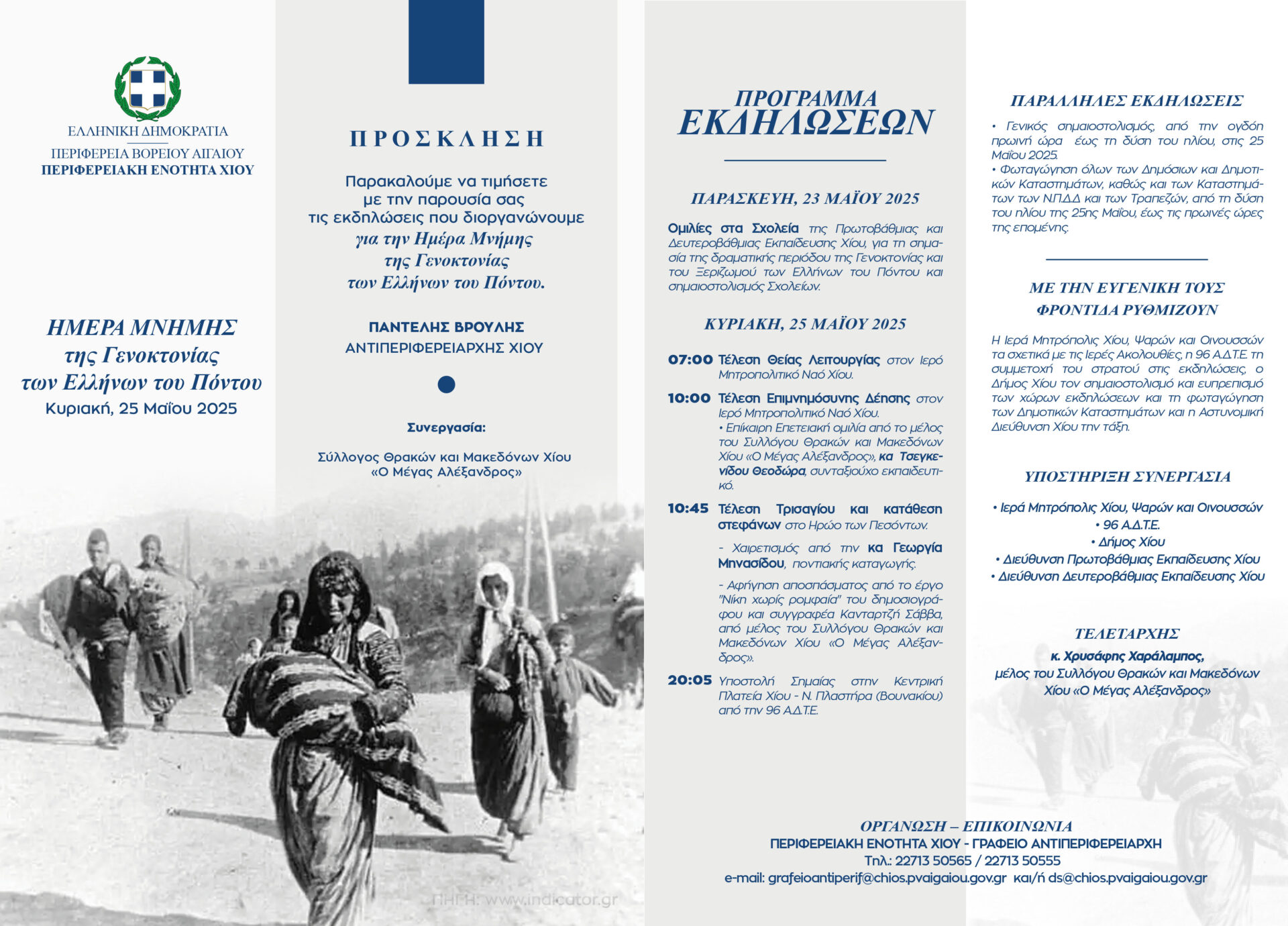 Παρακαλούμε να τιμήσετε με την παρουσία σας τις εκδηλώσεις που διοργανώνουμε για την Ημέρα Μνήμης της γενοκτονίας των Ελλήνων του Πόντου. ΠΑΝΤΕΛΗΣ ΒΡΟΥΛΗΣ Αντιπεριφερειάρχης Χίου Συνεργασία: Σύλλογος Θρακών και Μακεδόνων Χίου «Ο Μέγας Αλέξανδρος» Πρόγραμμα Εκδηλώσεων: Παρασκευή, 23 Μαΐου 2025 Ομιλίες στα Σχολεία της Πρωτοβάθμιας και Δευτεροβάθμιας Εκπαίδευσης Χίου, για τη σημασία της δραματικής περιόδου της Γενοκτονίας και του Ξεριζωμού των Ελλήνων του Πόντου και σημαιοστολισμός Σχολείων. Κυριακή, 25 Μαΐου 2025 07:00 Τέλεση Θείας Λειτουργίας στον Ιερό Μητροπολιτικό Ναό Χίου. 10:00 Τέλεση Δοξολογίας στον Ιερό Μητροπολιτικό Ναό Χίου. Επίκαιρη…