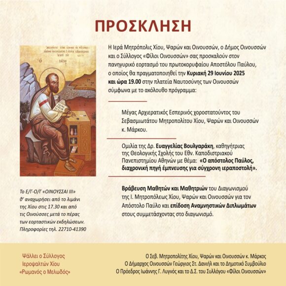 Η Ιερά Μητρόπολις Χίου, Ψαρών και Οινουσσών, ο Δήμος Οινουσσών και ο Σύλλογος «Φίλοι Οινουσσών» σας προσκαλούν στον πανηγυρικό εορτασμό του πρωτοκορυφαίου Αποστόλου Παύλου, ο οποίος θα πραγματοποιηθεί την Κυριακή 29 Ιουνίου 2025 και ώρα 19:00, στην πλατεία Ναυτοσύνης των Οινουσσών. Πρόγραμμα Εκδήλωσης: Μέγας Αρχιερατικός Εσπερινός, χοροστατούντος του Σεβασμιωτάτου Μητροπολίτου Χίου, Ψαρών και Οινουσσών κ. Μάρκου. Ομιλία της Δρ. Ευαγγελίας Βουλγαράκη, καθηγήτριας της Θεολογικής Σχολής του ΕΚΠΑ, με θέμα:«Ο Απόστολος Παύλος, διαχρονική πηγή έμπνευσης για σύγχρονη ιεραποστολή». Βράβευση Μαθητών και Μαθητριών του Διαγωνισμού της Ι. Μητροπόλεως Χίου, Ψαρών και Οινουσσών…