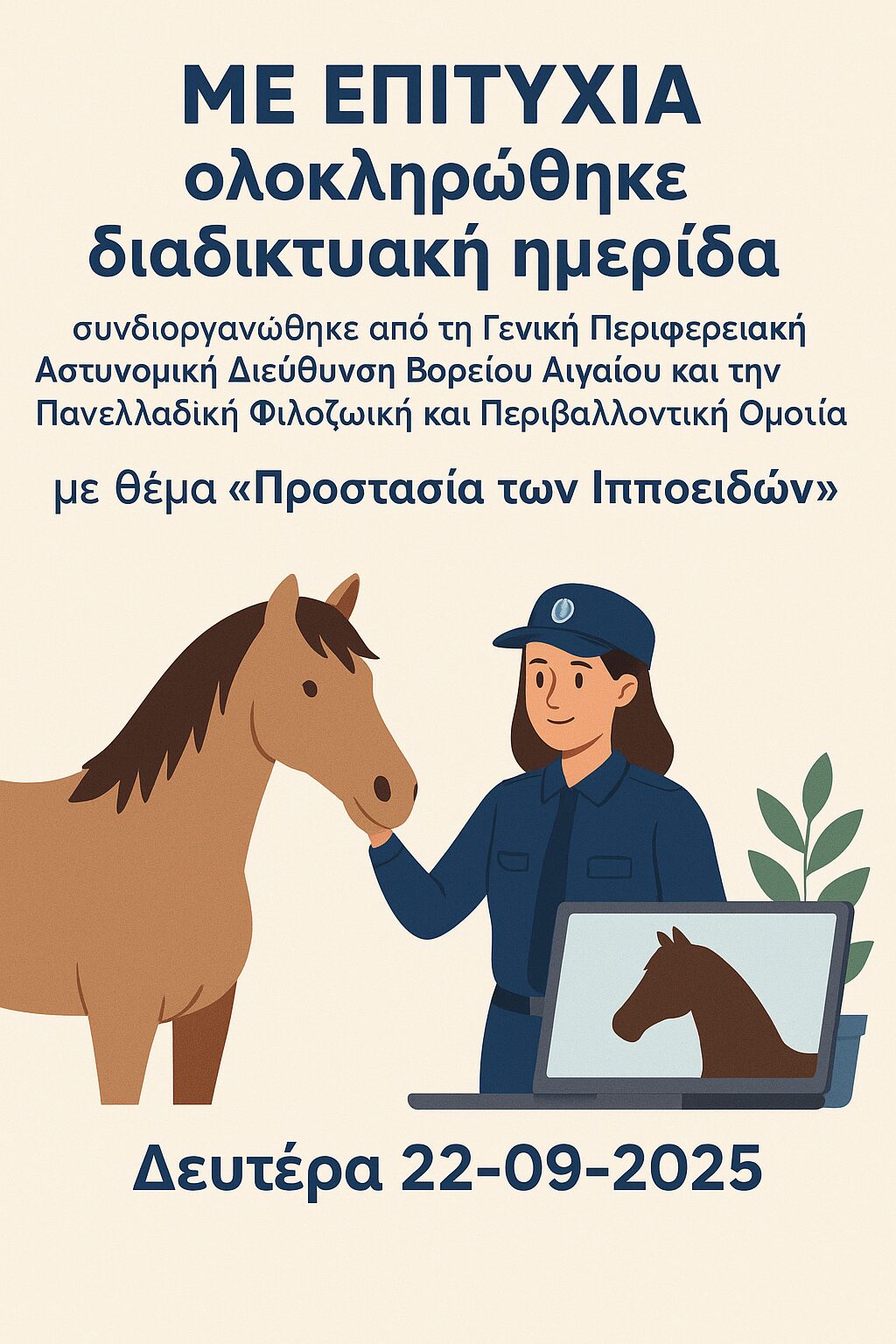 Με επιτυχία ολοκληρώθηκε διαδικτυακή ημερίδα, που συνδιοργανώθηκε από τη Γενική Περιφερειακή Αστυνομική Διεύθυνση Βορείου Αιγαίου και την Πανελλαδική Φιλοζωική και Περιβαλλοντική Ομοσπονδία, με θέμα «Προστασία των Ιπποειδών» Με επιτυχία ολοκληρώθηκε την Δευτέρα 22-09-2025, διαδικτυακή ημερίδα με θέμα «Προστασία των Ιπποειδών», που συνδιοργανώθηκε και υλοποιήθηκε με μέριμνα της Γενικής Περιφερειακής Αστυνομικής Διεύθυνσης Βορείου Αιγαίου και της Πανελλαδικής Φιλοζωικής και Περιβαλλοντικής Ομοσπονδίας. Η εν λόγω ημερίδα πραγματοποιήθηκε στο πλαίσιο του Εθνικού Σχεδίου Δράσης για τα δικαιώματα των ζώων ανά την επικράτεια, την οποία παρακολούθησαν στελέχη αστυνομικών υπηρεσιών του Βορείου Αιγαίου. Τις…