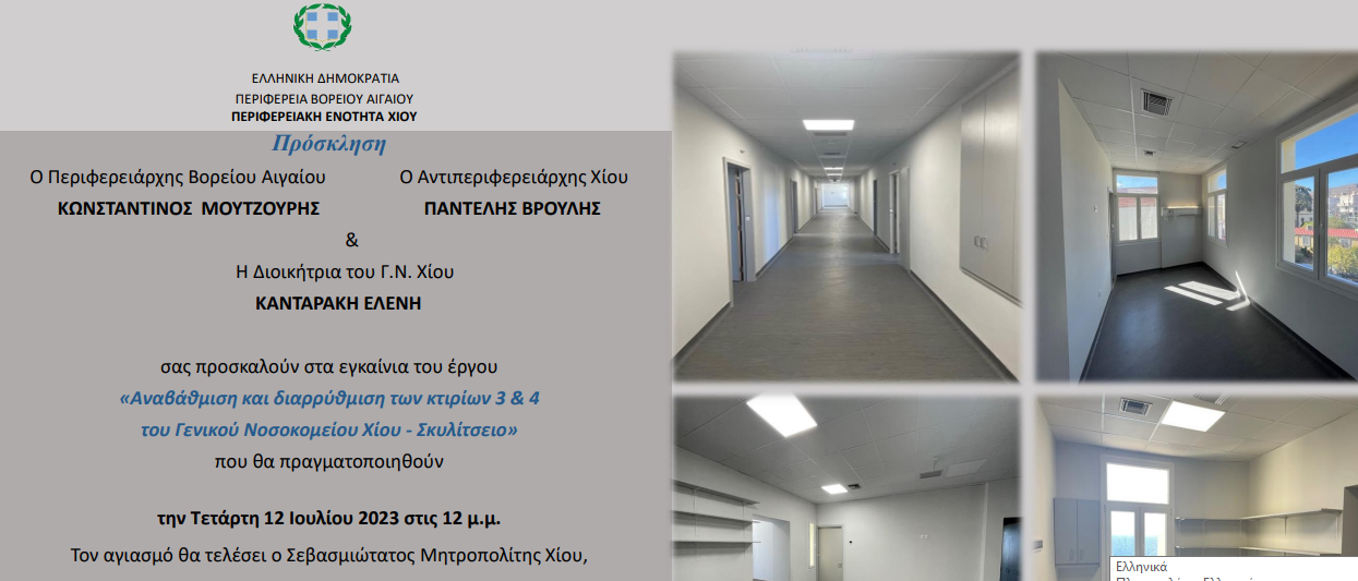 Την Τετάρτη 12 Ιουλίου 2023,πραγματοποιήθηκαν στο Γενικό Νοσοκομείο Χίου τα εγκαίνια του έργου «Αναβάθμιση και διαρρύθμιση των κτιρίων 3 & 4 του Γενικού Νοσοκομείου Χίου –Σκυλίτσειο». Παρουσία του Σεβασμιωτάτου Μητροπολίτη Χίου, Ψαρών και Οινουσσών,κ. Μάρκου, ο οποίος τέλεσε τον αγιασμό, της πολιτικής και στρατιωτικής ηγεσίας του τόπου, καθώς και Αρχών, αλλά και του Υποδιοικητής της 2ης Υ.ΠΕ. Πειραιώς και Αιγαίου, κ. Περικλή Αλεβίζου, του ιατρικού και νοσηλευτικού προσωπικού καιτου ιατρικού κόσμου του νησιού μας, καθώς και κοινού. Στην τελετή των εγκαινίων απηύθυναν χαιρετισμό ο Περιφερειάρχης Βορείου Αιγαίου, κ. Κωνσταντίνος…