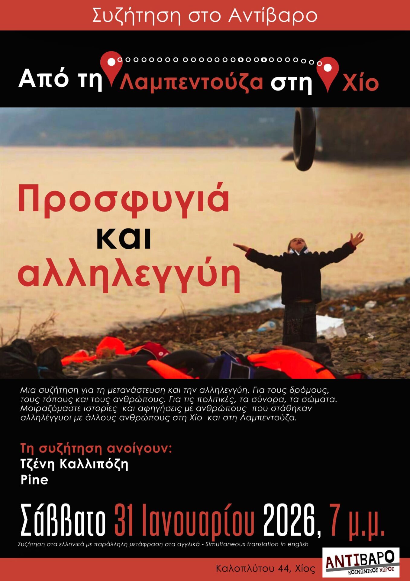 «Από τη Λαμπεντούζα στη Χίο – Προσφυγιά και αλληλεγγύη»: Συζήτηση στο «Αντίβαρο» το Σάββατο 31/1/2026 Tο Σάββατο 31 Ιανουαρίου, στις 7 το απόγευμα, το «Αντίβαρο» μας καλεί σε μια συζήτηση για τη μετανάστευση και την αλληλεγγύη. Για τους δρόμους, τους τόπους και τους ανθρώπους. Για τις πολιτικές, τα σύνορα, τα σώματα. Για να μοιραστούμε ιστορίες και αφηγήσεις με ανθρώπους που στέκονται αλληλέγγυοι με άλλους ανθρώπους στη Χίο και στη Λαμπεντούζα. Το 2015 εκατοντάδες χιλιάδες άνθρωποι διέσχισαν το Αιγαίο αναζητώντας καλύτερη τύχη, μακριά από τον πόλεμο, τη φτώχεια, τις κάθε λογής…