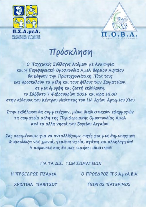 Ο Παγχιακός Σύλλογος Ατόμων με Αναπηρία (ΑμεΑ) και η Περιφερειακή Ομοσπονδία ΑμεΑ Βορείου Αιγαίου σας προσκαλούν στην κοπή της Πρωτοχρονιάτικης Πίτας τους, σε μια ζεστή και όμορφη εκδήλωση. Η εκδήλωση θα πραγματοποιηθεί το Σάββατο 7 Φεβρουαρίου 2026, στις 18:00, στην αίθουσα του Κέντρου Νεότητας του Ι.Ν. Αγίου Αρτεμίου Χίου. Στην εκδήλωση θα συμμετάσχουν διαδικτυακά τα σωματεία μέλη της Περιφερειακής Ομοσπονδίας ΑμεΑ από τα υπόλοιπα νησιά του Βορείου Αιγαίου, δίνοντας την ευκαιρία για ευρύτερη επικοινωνία και ανταλλαγή ευχών. Η εκδήλωση αποτελεί μια ευκαιρία να ανταλλάξουμε ευχές για μια δημιουργική και…