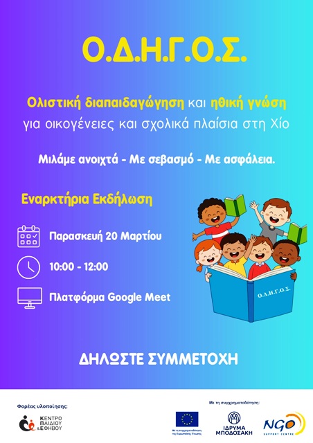 Εναρκτήρια Εκδήλωση του έργου ΟΔΗΓΟΣ Μιλώντας στα παιδιά για σώμα, όρια και σεβασμό Το Κέντρο Παιδιού και Εφήβου ανακοινώνει τη διαδικτυακή εναρκτήρια εκδήλωση του έργου «ΟΔΗΓΟΣ – Ολιστική Διαπαιδαγώγηση και Ηθική Γνώση για Οικογένειες και Σχολικά πλαίσια στη Χίο». Η εναρκτήρια εκδήλωση ανοίγει τον διάλογο γύρω από τη σημασία της σεξουαλικής διαπαιδαγώγησης από την παιδική ηλικία, αναδεικνύοντας τον ρόλο της οικογένειας και του σχολείου στη διαμόρφωση ενός ασφαλούς και υποστηρικτικού περιβάλλοντος για τα παιδιά. Στο πλαίσιο αυτό, το έργο ΟΔΗΓΟΣ ξεκινάει στη Χίο, φέροντας κοντά εκπαιδευτικούς, γονείς και παιδιά μέσα…