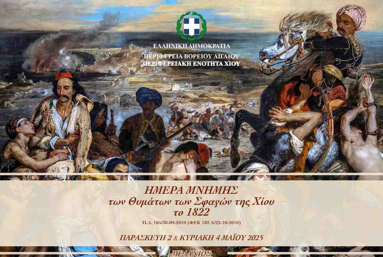 🕊️ Εκδηλώσεις Τιμής για τα Θύματα των Σφαγών της Χίου – Κυριακή των Μυροφόρων στο Μελανιό Η Χίος θυμάται και τιμά τους ήρωες του 1822 Την Κυριακή των Μυροφόρων, 4 Μαΐου 2025, θα πραγματοποιηθούν στο Μελανιό Χίου εκδηλώσεις τιμής και μνήμης για τα θύματα των Σφαγών της Χίου του 1822, τα οποία θυσιάστηκαν για την Πίστη και την Ελευθερία, κατά τη διάρκεια της Ελληνικής Επανάστασης. Οι επετειακές εκδηλώσεις διοργανώνονται από την Περιφέρεια Βορείου Αιγαίου και την Περιφερειακή Ενότητα Χίου, σε συνεργασία με τον Πολιτιστικό Σύλλογο Μελανιούς «Η Μέλαινα Άκρα», και…