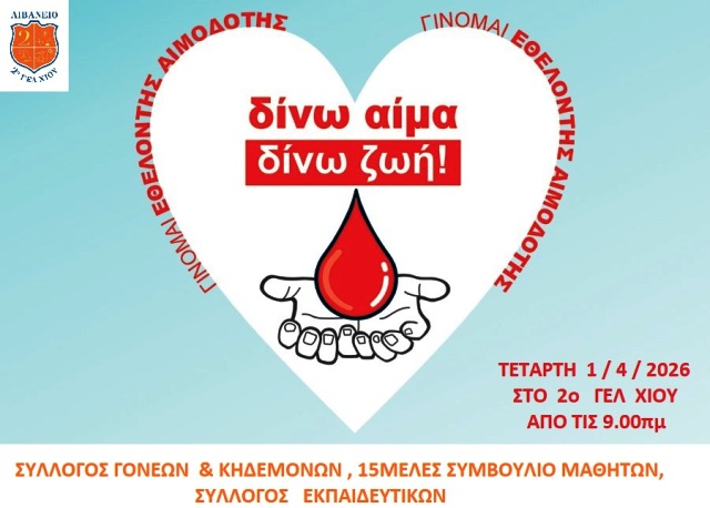 Το 2ο Γενικό Λύκειο Χίου «Λιβάνειο» διοργανώνει δράση εθελοντικής αιμοδοσίας την Τετάρτη 1 Απριλίου 2026, από τις 09:00 το πρωί, στους χώρους του σχολείου. Η πρωτοβουλία πραγματοποιείται με τη συνεργασία και τη στήριξη του Συλλόγου Γονέων και Κηδεμόνων, του 15μελούς Συμβουλίου των μαθητών και του Συλλόγου Διδασκόντων, με στόχο την ενίσχυση της τράπεζας αίματος και την προώθηση της αξίας της εθελοντικής προσφοράς προς τον συνάνθρωπο. Η εθελοντική αιμοδοσία αποτελεί μια πράξη αλληλεγγύης και ανθρωπιάς που μπορεί να σώσει ζωές. Μέσα από αυτή τη δράση, η σχολική κοινότητα του 2ου ΓΕΛ…
