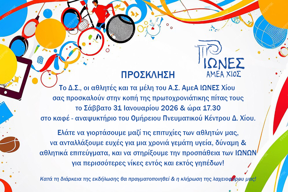 Το Σάββατο 31 Ιανουαρίου και ώρα 6.00 μμ. το αθλητικό σωματείο ΑμεΑ ΙΩΝΕΣ Χίου θα κόψει την πρωτοχρονιάτικη πίτα του στο καφέ αναψυκτήριο του Ομηρείου Πνευματικού Κέντρου Δήμου Χίου. Όλοι οι αθλητές και οι οικογένειες, αλλά και οι φίλοι του Σωματείου είναι προσκεκλημένοι, καθώς είναι μια πολύ όμορφη ευκαιρία να συναντηθούμε και να ανταλλάξουμε τις ευχές μας για μια καλή αγωνιστική χρονιά!!! Κατά τη διάρκεια της εκδήλωσης θα γίνει και η κλήρωση της λαχειοφόρου μας, την οποία διοργανώσαμε με σκοπό την εξεύρεση πόρων απαραίτητων για τη συντήρηση των αθλητικών μας…