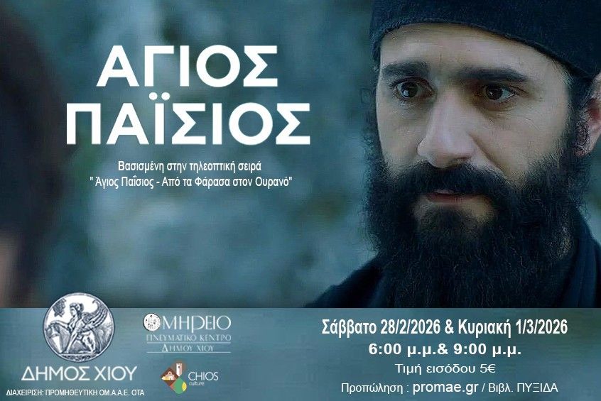 Ο Δήμος Χίου και το Ομήρειο Πνευματικό Κέντρο Δήμου Χίου συνεχίζουν τις κινηματογραφικές τους προβολές και προσκαλούν το κοινό σε ένα ξεχωριστό διήμερο αφιερωμένο στην ταινία «Άγιος Παΐσιος». Οι προβολές θα πραγματοποιηθούν το Σάββατο 28 Φεβρουαρίου και την Κυριακή 1 Μαρτίου 2026, με δύο ώρες προβολής κάθε ημέρα (18:00 και 21:00), στην αίθουσα του Ομηρείου. Η ταινία αποτελεί κινηματογραφική μεταφορά της ιδιαίτερα επιτυχημένης τηλεοπτικής σειράς «Άγιος Παΐσιος – Από τα Φάρασα στον Ουρανό» και καταγράφει με σεβασμό και συγκίνηση τη ζωή και την πνευματική πορεία του Άγιος Παΐσιος ο Αγιορείτης,…
