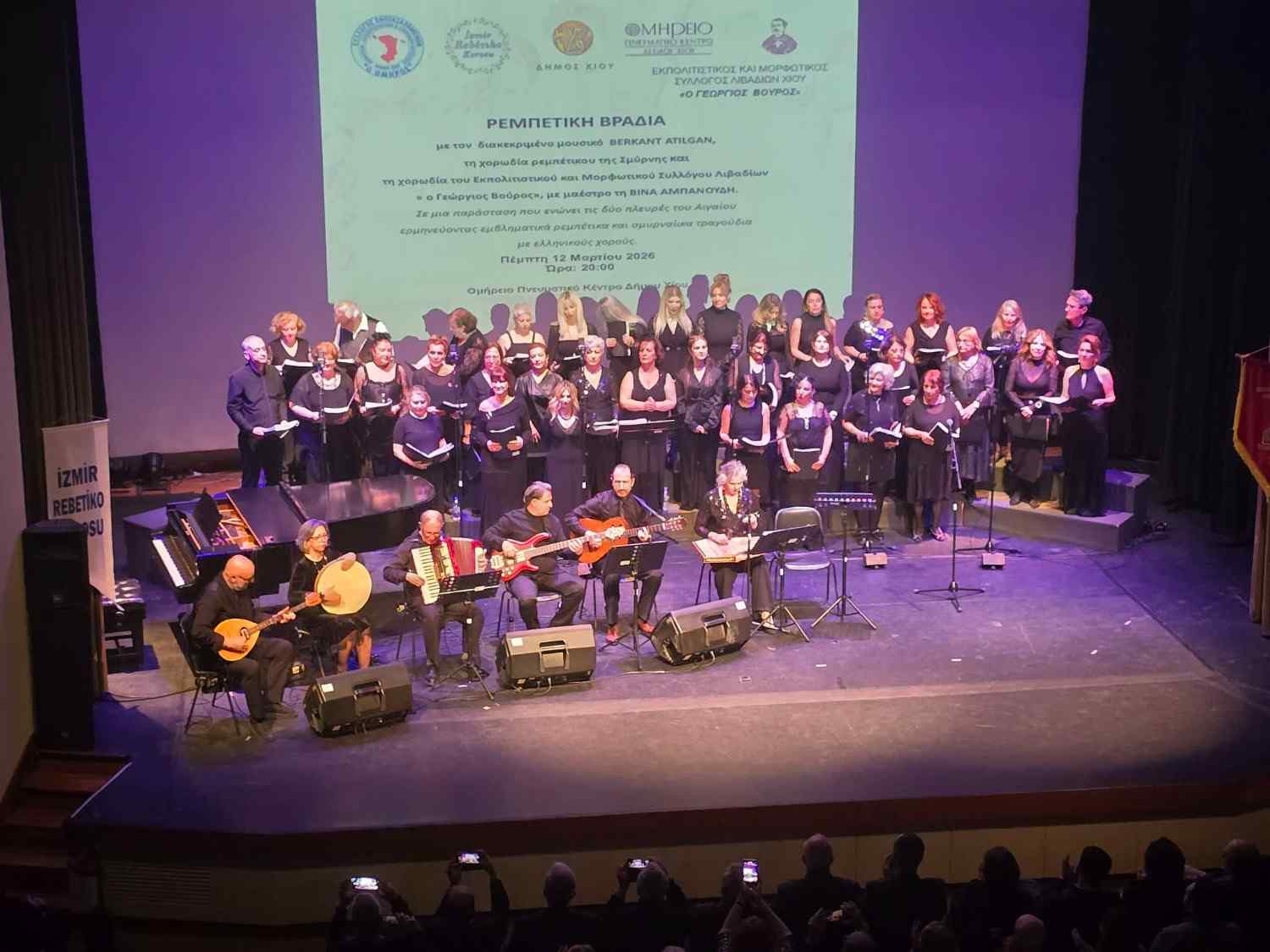 Χίος και Σμύρνη τραγούδησαν μαζί στο Ομήρειο σε μια μεγάλη βραδιά για το ρεμπέτικο Μια ξεχωριστή μουσική και πολιτιστική βραδιά έζησε η Χίος στο Ομήρειο Πνευματικό Κέντρο του Δήμου Χίου, σε μια εκδήλωση αφιερωμένη στην κοινή πολιτιστική κληρονομιά του Αιγαίου. Η διοργάνωση πραγματοποιήθηκε από τον Σύλλογο Ενοικιαζομένων Δωματίων, Διαμερισμάτων και Τουριστικών Επιπλωμένων Κατοικιών Χίου «Ο Όμηρος», φέρνοντας επί σκηνής δύο σημαντικά χορωδιακά σύνολα. Ιδιαίτερη συγκίνηση προκάλεσε η παρουσία της 40μελούς χορωδίας ρεμπέτικου της Σμύρνης (Izmir Rebetiko Korosu), υπό τη διεύθυνση του μαέστρου Berkant Atılgan, η οποία ερμήνευσε γνωστά ρεμπέτικα τραγούδια…