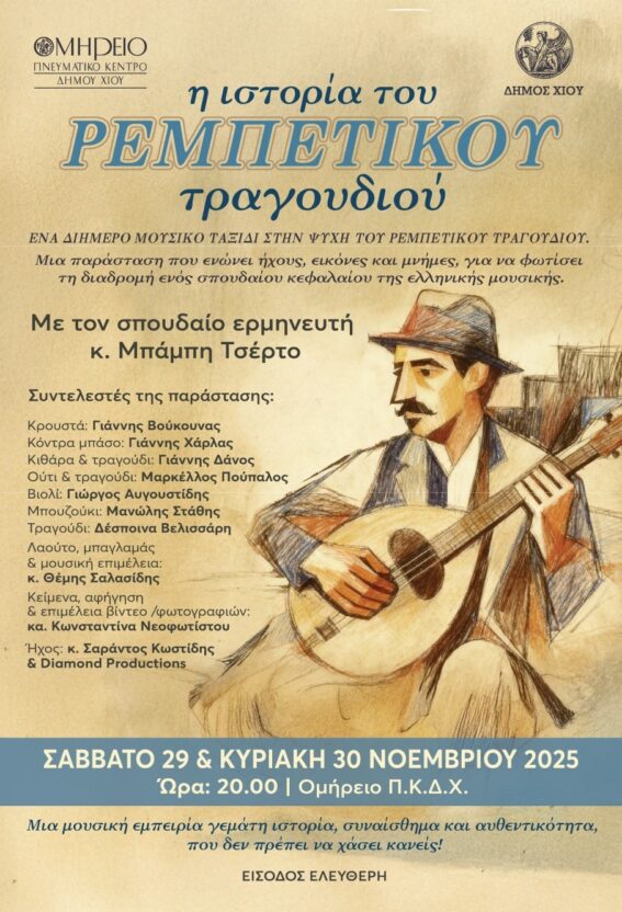 -Με τον Μπάμπη Τσέρτο και Χιώτες μουσικούς- Το Ομήρειο Πνευματικό Κέντρο φιλοξενεί δύο μοναδικές μουσικές βραδιές αφιερωμένες στο ρεμπέτικο, με τον Μπάμπη Τσέρτο και εκλεκτούς Χιώτες μουσικούς να παρουσιάζουν ένα ταξίδι στις ρίζες και τις κορυφαίες στιγμές του είδους. Ομήρειο Πνευματικό Κέντρο Δήμου Χίου Σάββατο 29 & Κυριακή 30 Νοεμβρίου Ώρα έναρξης: 20:00 Δελτία εισόδου διανέμονται στην είσοδο του Ομήρειου Πνευματικού Κέντρου του Δήμου Χίου.