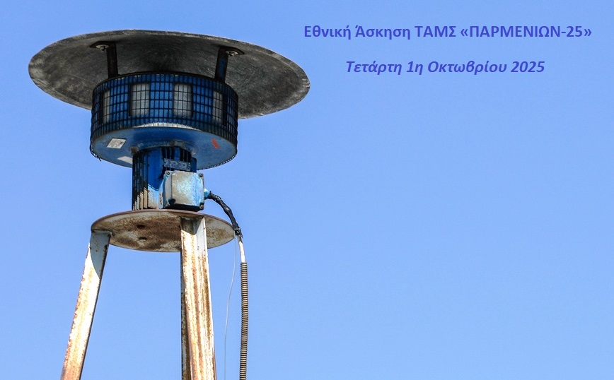 Ανακοινώνεται ότι την Τετάρτη 1 Οκτωβρίου 2025, στο πλαίσιο της Άσκησης ΤΑΜΣ «ΠΑΡΜΕΝΙΩΝ-25», θα πραγματοποιηθεί δοκιμαστική ενεργοποίηση του συνόλου των σειρήνων συναγερμού Πολιτικής Άμυνας σε όλη την Επικράτεια, σύμφωνα με το παρακάτω πρόγραμμα: Ώρα 11:00 – Σήμανση συναγερμού αεροπορικής επίθεσης, διάρκειας 60’’ (διακοπτόμενος ήχος διαφορετικής έντασης). Ώρα 11:05 – Σήμανση λήξης συναγερμού, διάρκειας 60’’ (συνεχής ήχος σταθερής έντασης). Ώρα 11:30 – Σήμανση προειδοποιητικού συναγερμού ΧΒΡΠ απειλής, διάρκειας 120’’ (διακοπτόμενος ήχος διαφορετικής έντασης). Ώρα 11:35 – Σήμανση λήξης συναγερμού, διάρκειας 60’’ (συνεχής ήχος σταθερής έντασης). Ώρα 12:50 – Σήμανση προειδοποιητικού συναγερμού…