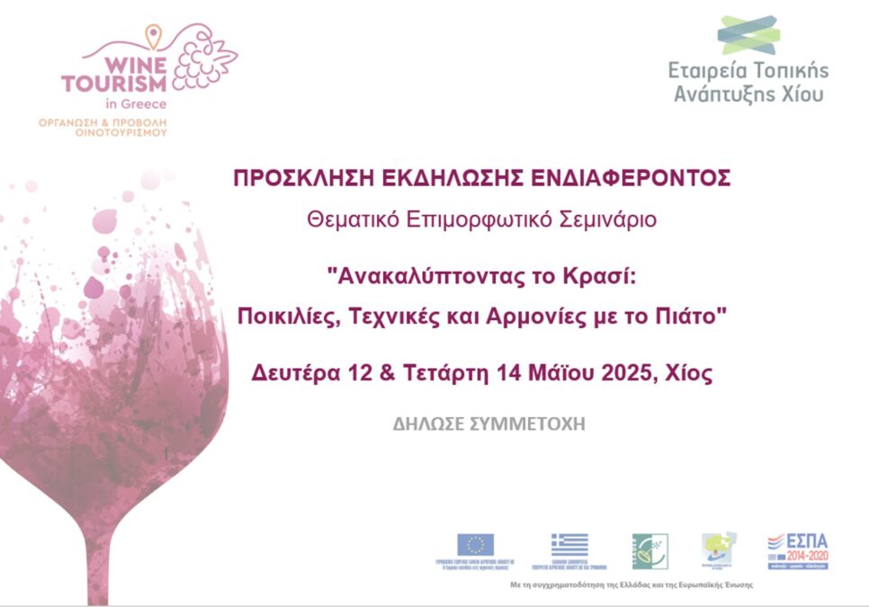 Επιμορφωτικό Θεματικό Σεμινάριο «Ανακαλύπτοντας το Κρασί: Ποικιλίες, Τεχνικές και Αρμονίες με το Πιάτο» Η ΕΤΑΧ ΑΑΕ ΟΤΑ διοργανώνει θεματικό επιμορφωτικό σεμινάριο με θέμα: «Ανακαλύπτοντας το Κρασί: Ποικιλίες, Τεχνικές και Αρμονίες με το Πιάτο». Καλεί ενδιαφερόμενους επαγγελματίες και εργαζόμενους από τον χώρο της εστίασης και της φιλοξενίας, (Front line staff) όπως δηλώσουν τη συμμετοχή τους. Προς διευκόλυνση των συμμετεχόντων, το σεμινάριο θα λάβει χώρα σε δύο ημέρες με την ίδια θεματολογία. Η δράση υλοποιείται στο πλαίσιο του Διατοπικού Σχεδίου Συνεργασίας « ΟΡΓΑΝΩΣΗ & ΠΡΟΒΟΛΗ ΟΙΝΟΤΟΥΡΙΣΜΟΥ » του ΠΑΑ 2014-2020 Υπομέτρο…