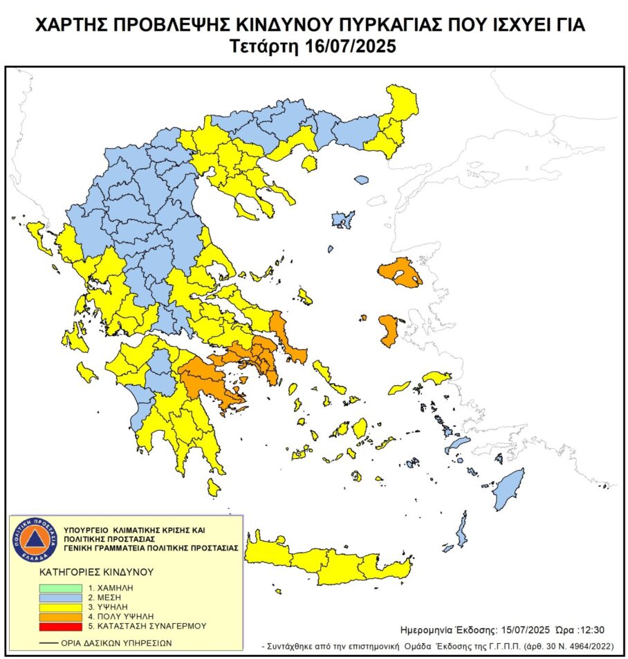 Σας ενημερώνουμε ότι εκδόθηκε ο ημερήσιος Χάρτης Πρόβλεψης Κινδύνου Πυρκαγιάς για 16/7/2025 Στον ανωτέρω χάρτη ο Δήμος μας βρίσκεται σε κατηγορία κινδύνου: 4 Πολύ Υψηλός Κίνδυνος εκδήλωσης Πυρκαγιάς  Σύμφωνα με το Χάρτη Πρόβλεψης Κινδύνου Πυρκαγιάς που εκδίδει η Γενική Γραμματεία Πολιτικής Προστασίας του Υπουργείου Κλιματικής Κρίσης & Πολιτικής Προστασίας (civilprotection.gov.gr), για  αύριο Τετάρτη 16 Ιουλίου 2025, προβλέπεται πολύ υψηλός κίνδυνος πυρκαγιάς (κατηγορία κινδύνου 4) για τις εξής περιοχές: Περιφέρεια Αττικής Περιφέρεια Στερεάς Ελλάδας (ΠΕ Βοιωτίας, ΠΕ Εύβοιας) Περιφέρεια Πελοποννήσου (ΠΕ Κορινθίας, ΠΕ Αργολίδας) Περιφέρεια Κρήτης Περιφέρεια Βορείου Αιγαίου (ΠΕ Λέσβου, ΠΕ Χίου, ΠΕ Σάμου, ΠΕ Ικαρίας) Η Γενική…