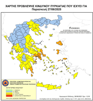 Σας ενημερώνουμε ότι εκδόθηκε από τη Γενική Γραμματεία Πολιτικής Προστασίας ο Ημερήσιος Χάρτης Πρόβλεψης Κινδύνου Πυρκαγιάς για την Παρασκευή 27 Ιουνίου 2025. Σύμφωνα με τον χάρτη, ο Δήμος μας κατατάσσεται στην Κατηγορία Κινδύνου 4, που αντιστοιχεί σε Πολύ Υψηλό Κίνδυνο εκδήλωσης πυρκαγιάς. Η Πολιτική Προστασία καλεί τους πολίτες να είναι ιδιαίτερα προσεκτικοί και να αποφεύγουν ενέργειες που μπορούν να προκαλέσουν πυρκαγιά από αμέλεια, όπως: Η καύση ξερών χόρτων και υπολειμμάτων καλλιεργειών, Η χρήση μηχανημάτων που προκαλούν σπινθήρες (τροχοί, ηλεκτροκολλήσεις), Το κάπνισμα μελισσών, Το πέταγμα αναμμένων τσιγάρων, Η χρήση υπαίθριων ψησταριών.…