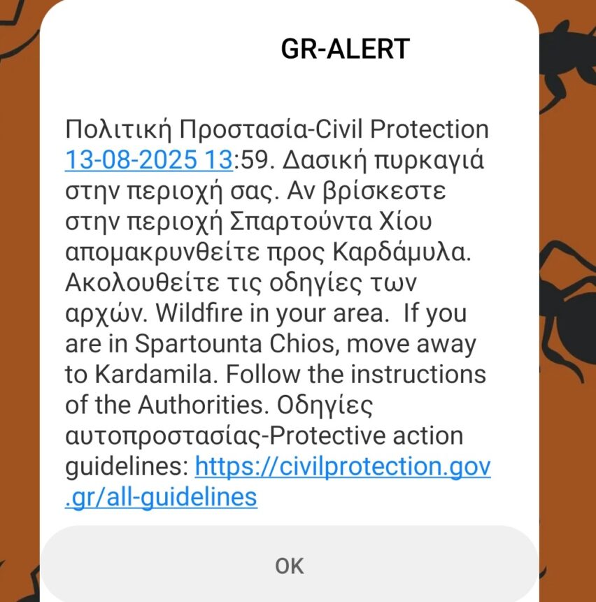 Πολιτική Προστασία – GR-ALERT13-08-2025, ώρα 13:59: Δασική πυρκαγιά στην περιοχή σας.Αν βρίσκεστε στην περιοχή Σπαρτούντα Χίου, απομακρυνθείτε προς Καρδάμυλα. Ακολουθείτε τις οδηγίες των αρχών. Οδηγίες αυτοπροστασίας: https://civilprotection.gov.gr/all-guidelines