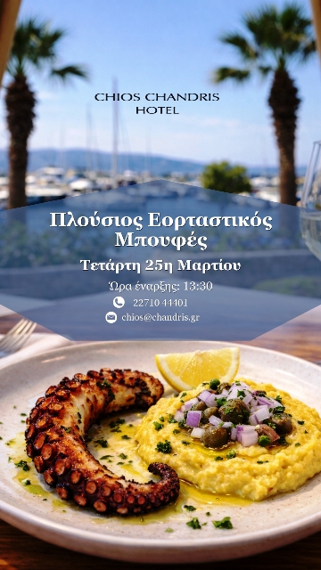 Το Chios Chandris Hotel σας προσκαλεί να γιορτάσετε την εθνική επέτειο της 25ης Μαρτίου με έναν ξεχωριστό εορταστικό μεσημεριανό μπουφέ. Απολαύστε πλούσιες γεύσεις και εκλεκτά Σαρακοστιανά εδέσματα, σε ένα φιλόξενο περιβάλλον με μαγευτική θέα στο λιμάνι. Η τιμή συμμετοχής ανέρχεται στα 30€ ανά άτομο, ενώ για παιδιά ηλικίας 5–11 ετών παρέχεται έκπτωση 50%.