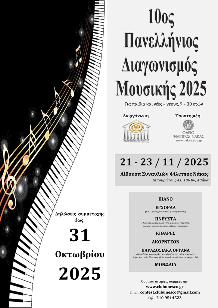 Προκήρυξη 10ου Πανελλήνιου Διαγωνισμού Μουσικής 2025 από τον Όμιλο για την UNESCO Τεχνών, Λόγου και Επιστημών Ελλάδος Ο Όμιλος για την UNESCO Τεχνών, Λόγου και Επιστημών Ελλάδος, με στόχο την υποστήριξη και την ανάδειξη νέων μουσικών ταλέντων στην Ελλάδα, προκηρύσσει τον 10ο Πανελλήνιο Διαγωνισμό Μουσικής για το έτος 2025. Ο διαγωνισμός πραγματοποιείται με την υποστήριξη του Ωδείου Φίλιππος Νάκας (Ιπποκράτους 41, Αθήνα) και απευθύνεται σε νέους μουσικούς, οι οποίοι θα διαγωνιστούν σε επτά μουσικές κατηγορίες: Πιάνο Έγχορδα (βιολί, βιόλα, βιολοντσέλο, κόντρα μπάσο) Πνευστά (φλάουτο, όμποε, κλαρινέτο, σαξόφωνο κλασικό, φαγκότο, τρομπέτα,…