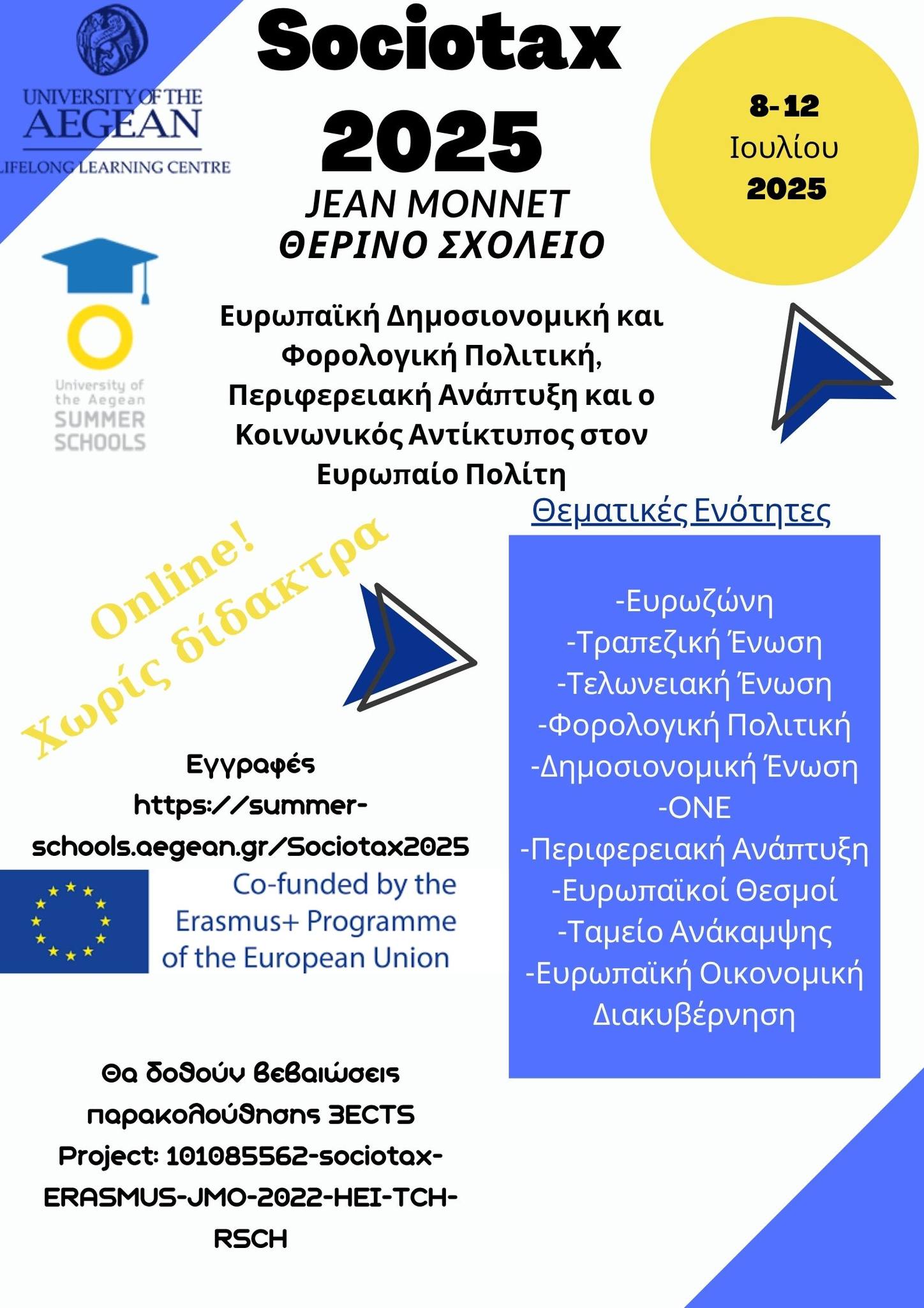 Το Πανεπιστήμιο Αιγαίου ανακοινώνει την έναρξη του 3ου Θερινού Σχολείου Sociotax 2025, το οποίο θα διεξαχθεί διαδικτυακά και χωρίς δίδακτρα, από τις 8 έως τις 12 Ιουλίου 2025. Πρόκειται για μια σημαντική εκπαιδευτική δράση που συνδιοργανώνεται από το Κέντρο Δια Βίου Μάθησης (ΚΕΔΙΒΙΜ), το Εργαστήριο Κοινωνικών και Πολιτικών Θεσμών και το Jean Monnet Module Sociotax της Ευρωπαϊκής Επιτροπής.