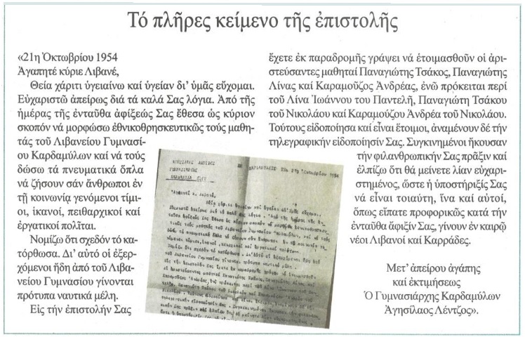 στα Εκπαιδευτήρια – και όχι μόνο – που έχει δημιουργήσει ο Καπετάν Παναγιώτης και η Οικογένειά του, διαβάζω και ένα γράμμα με ημερομηνία 21 Οκτωβρίου…1954, που υπογράφει ο Γυμνασιάρχης Καρδαμύλων Αγησίλαος Λέντζος, και που αξίζει τον κόπο να το παραθέσω αυτούσιο ως έχει: