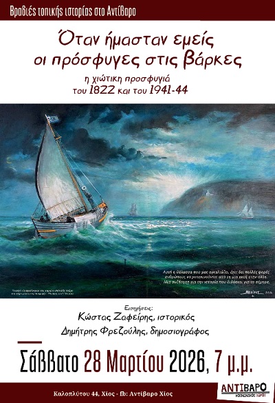 Την ιστορία της χιώτικης προσφυγιάς σε δυο διαφορετικές ιστορικές περιόδους φέρνει στο φως η επόμενη Βραδιά Τοπικής Ιστορίας στον Κοινωνικό Χώρο «Αντίβαρο» (Καλοπλύτου 44) το Σάββατο 28 Μαρτίου 2026, ώρα 19.00.